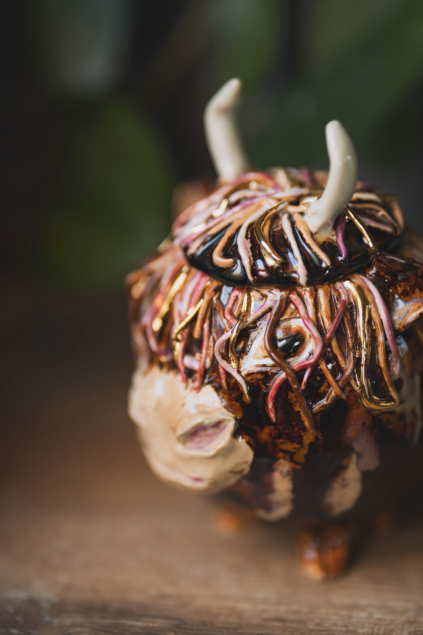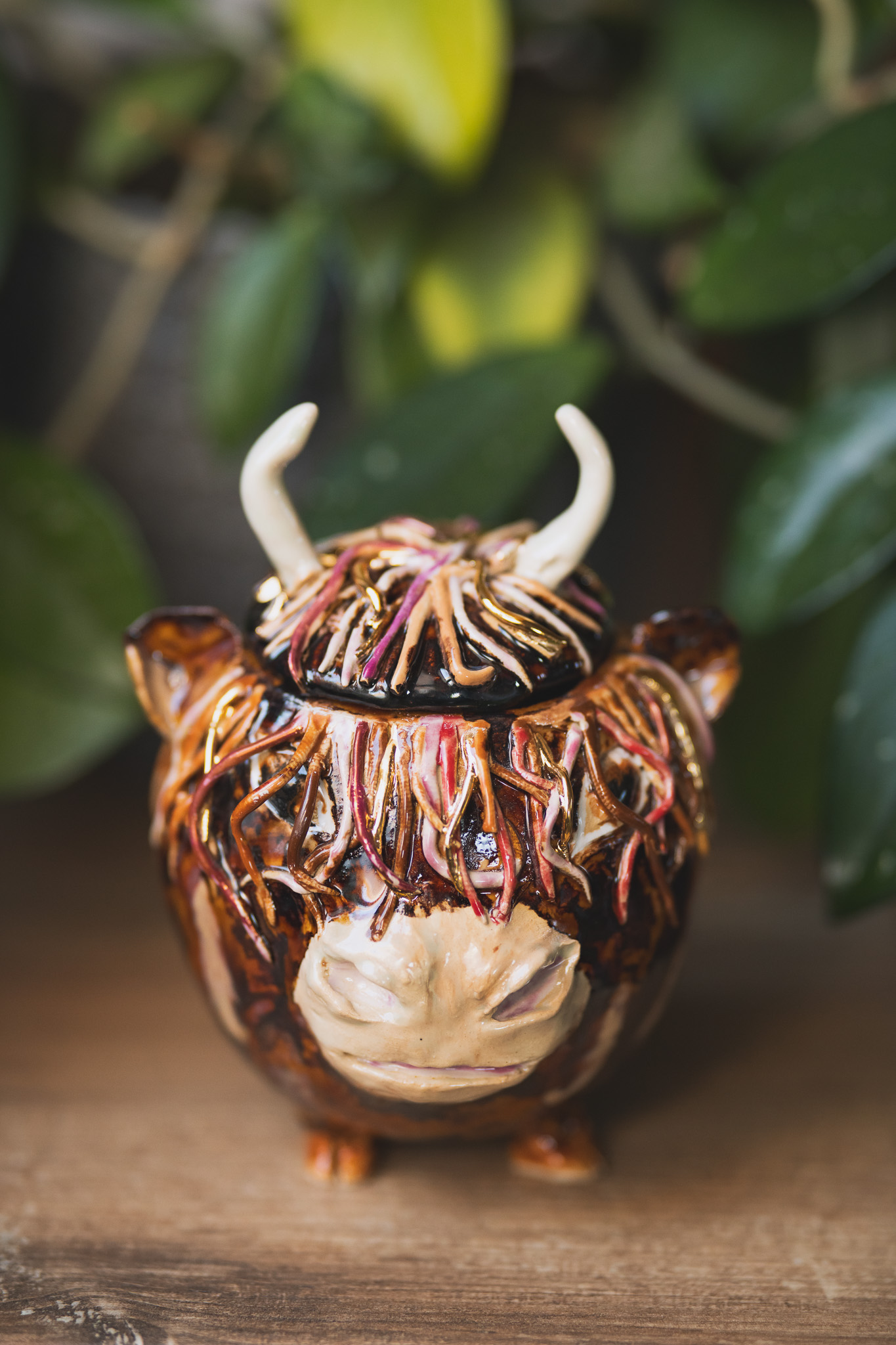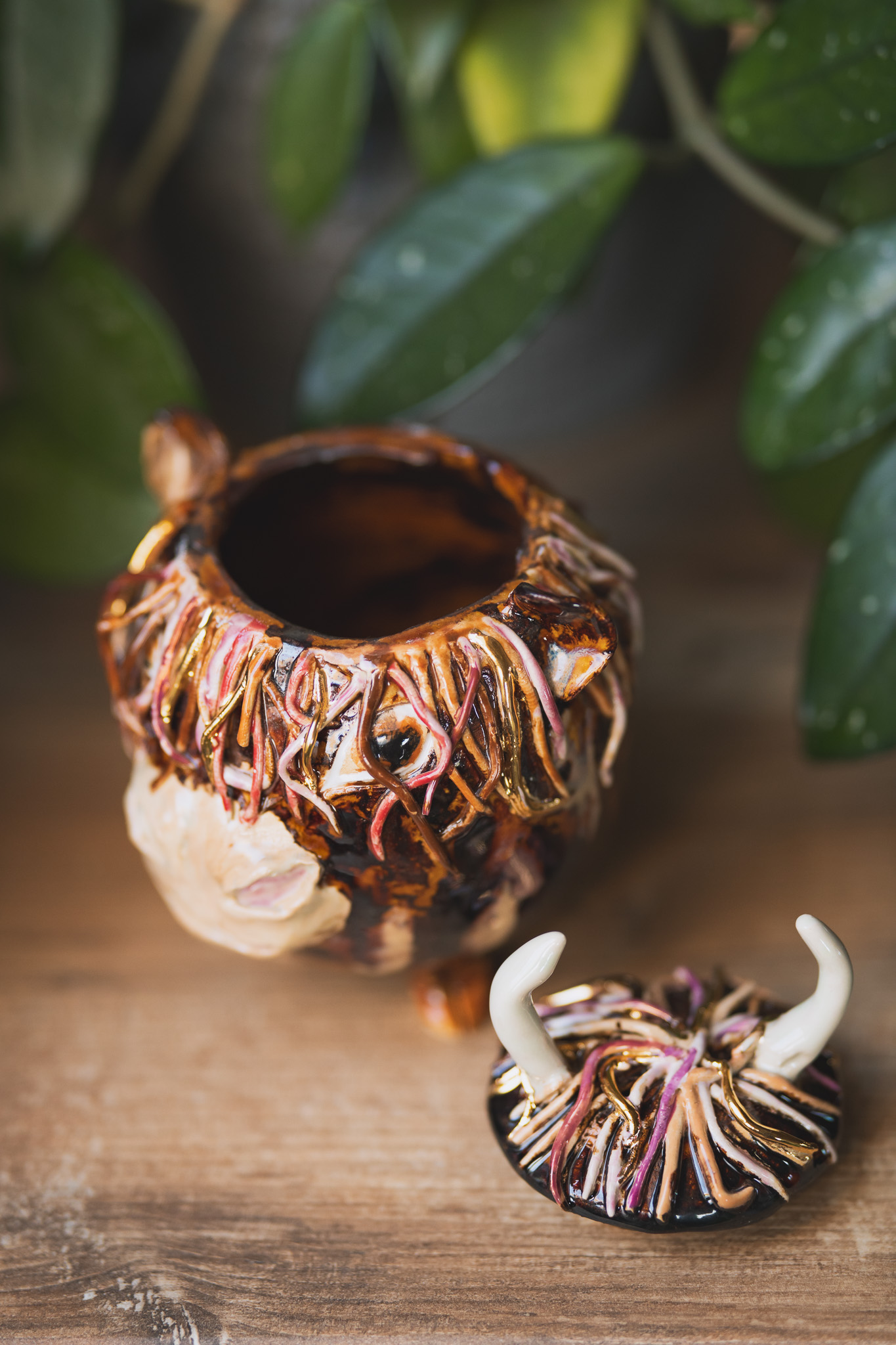 Ręcznie lepiona cukiernica z pokrywką, szkliwiona w karmelowych brązach z nutą różu i złota, jakby właśnie wyszła z ceramicznego fryzjera. Jej rogi też są gotowe na dzień pełen wyzwań (i herbatników).