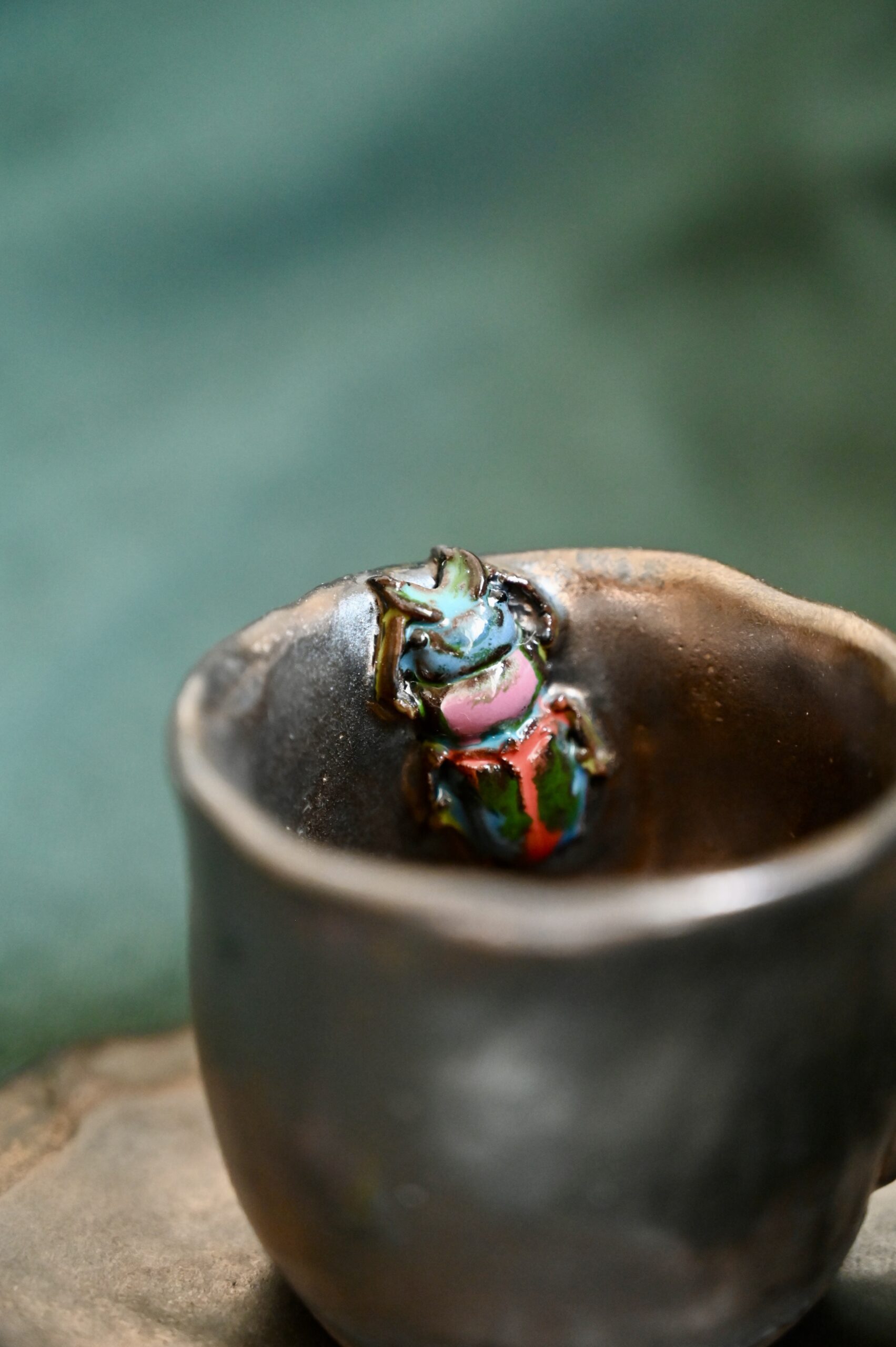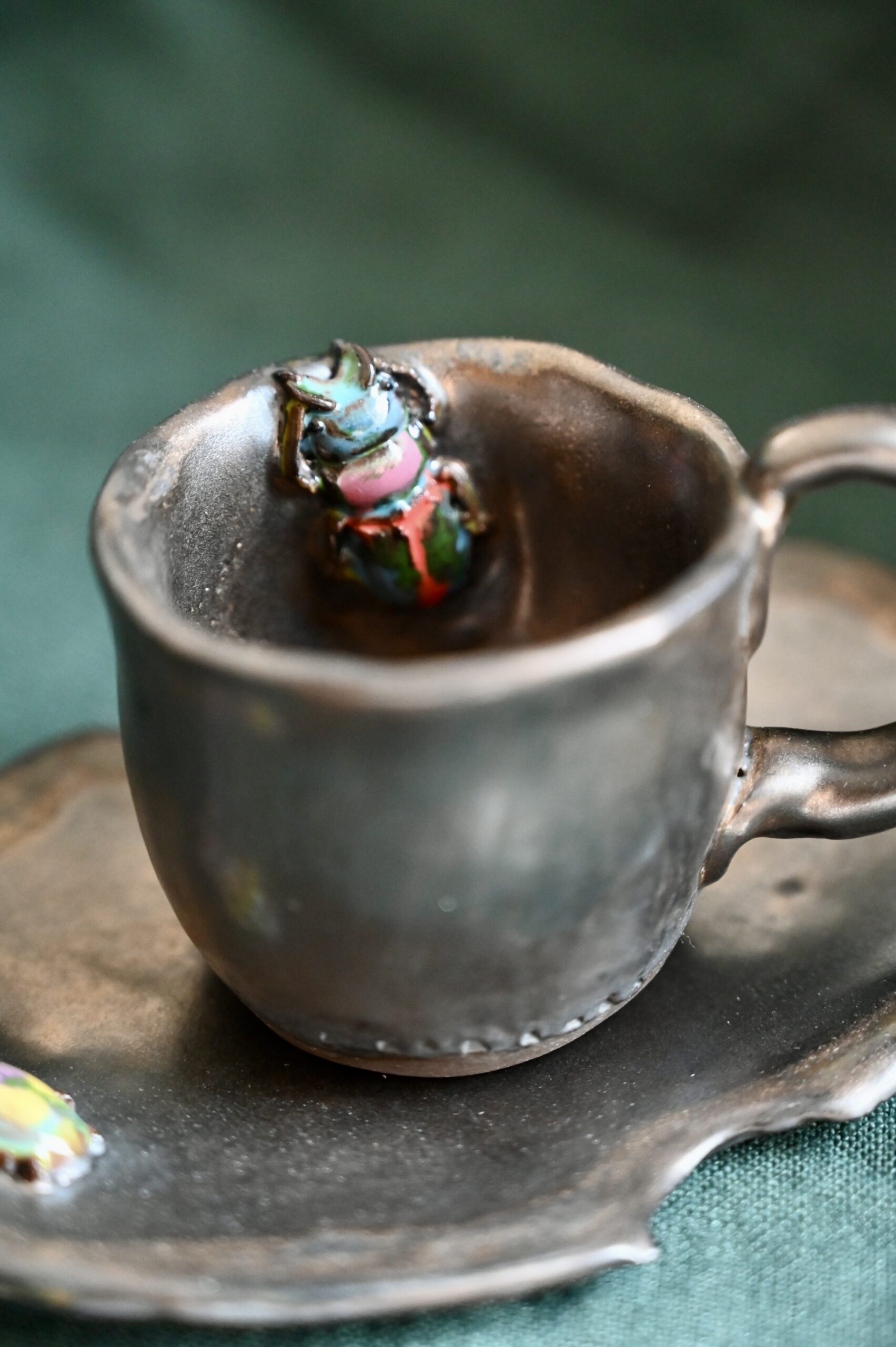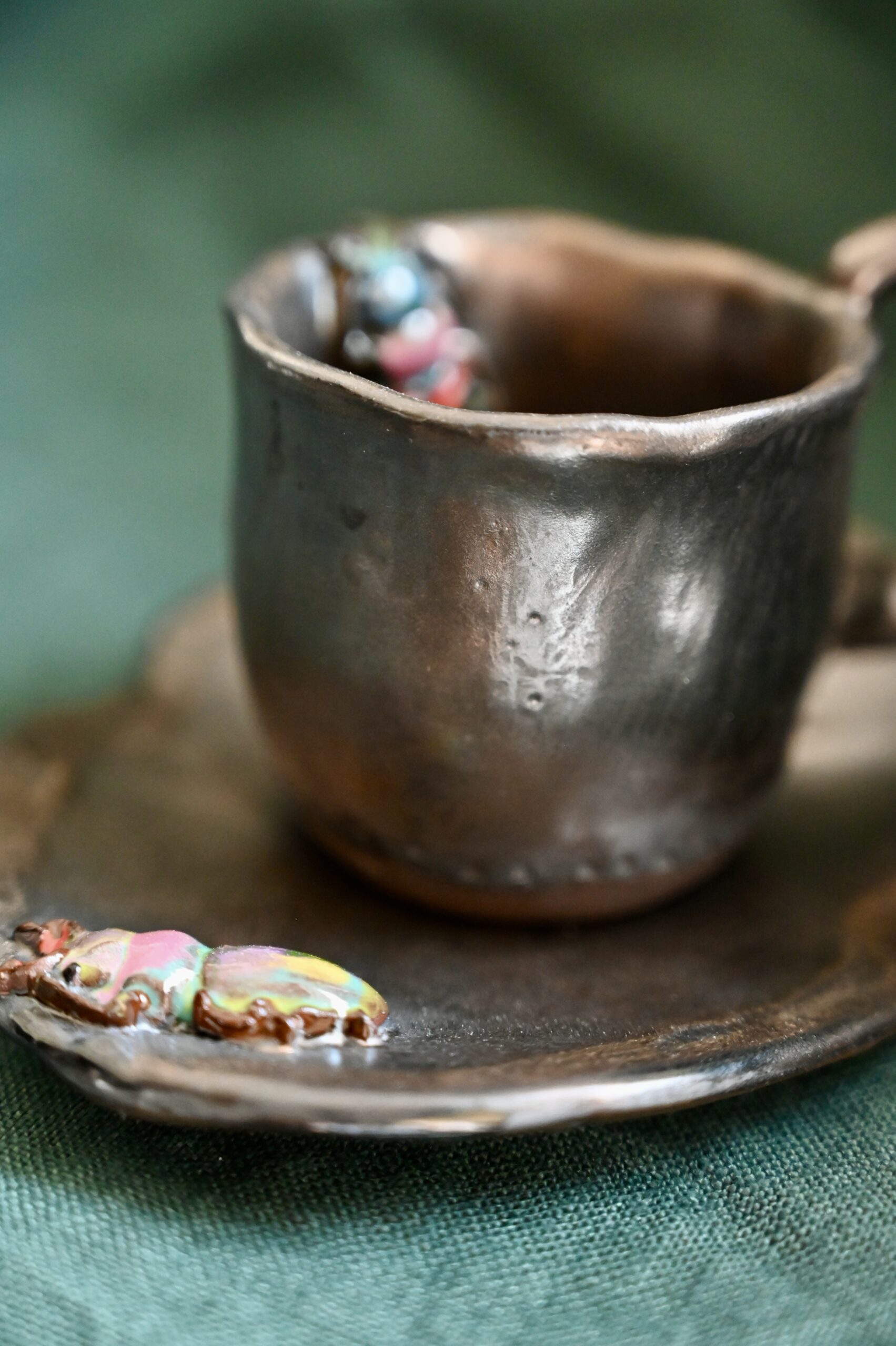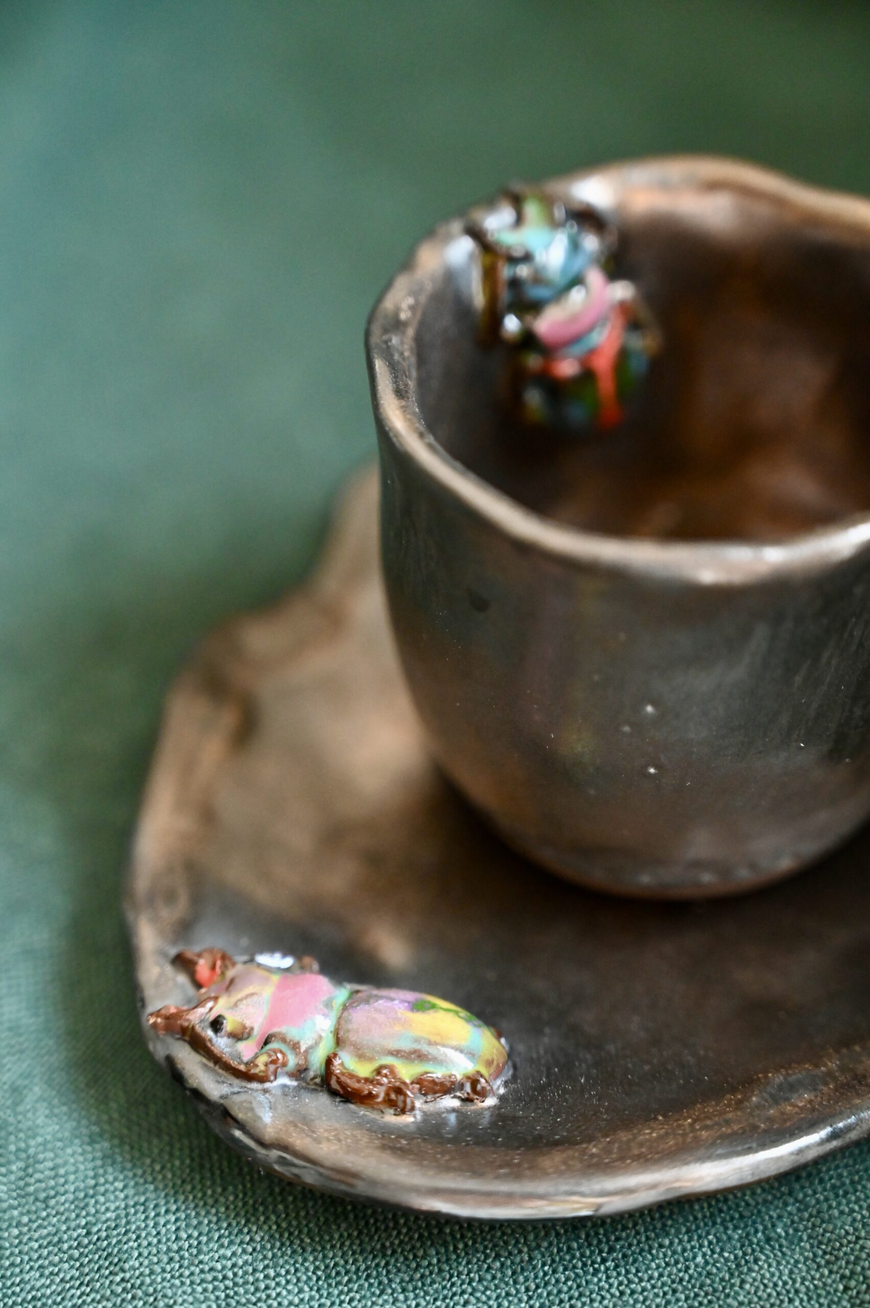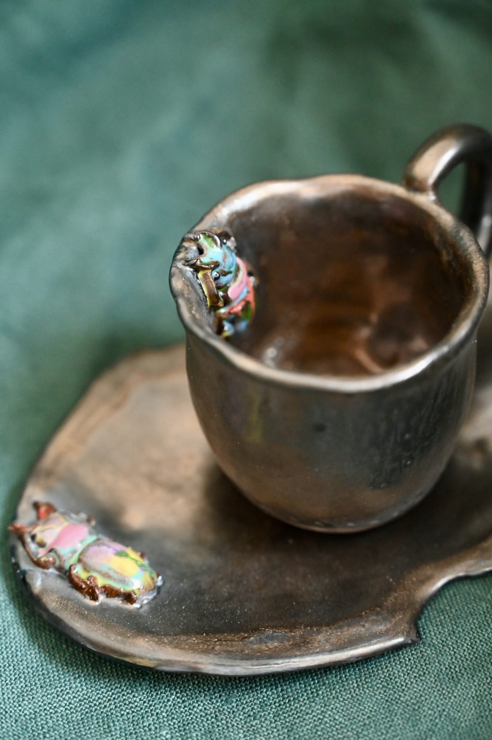 Maleńka filiżanka espresso z ręcznie formowanym żuczkiem — nie tylko na spodeczku, ale też w środku. Niby drobiazg, a jednak budzi uśmiech i opowiada historię. Kubeczek ma klasyczny, lekko retro kształt, a nieregularny talerzyk przypomina wycinankę z dzieciństwa.