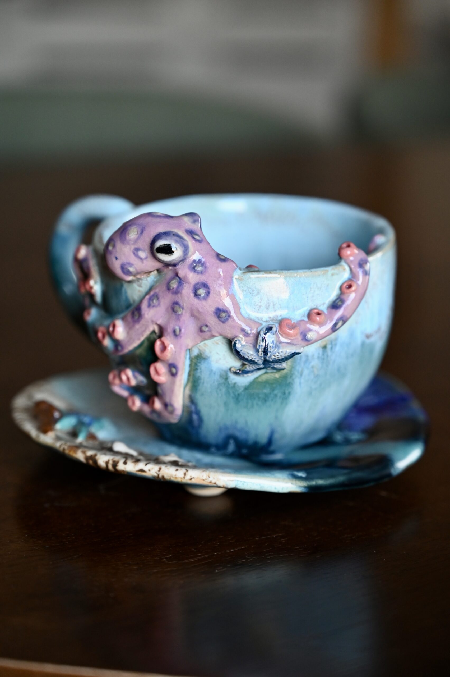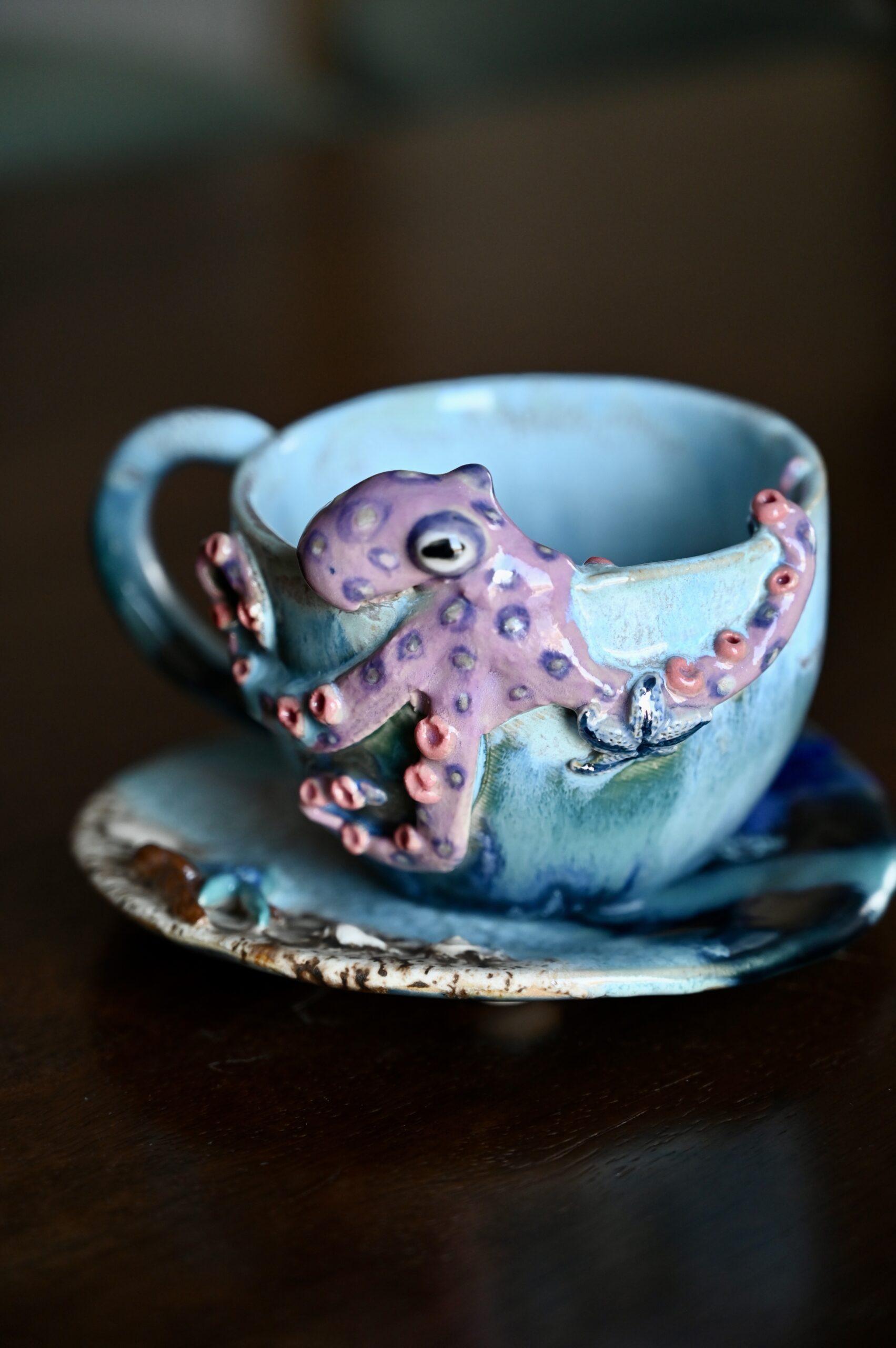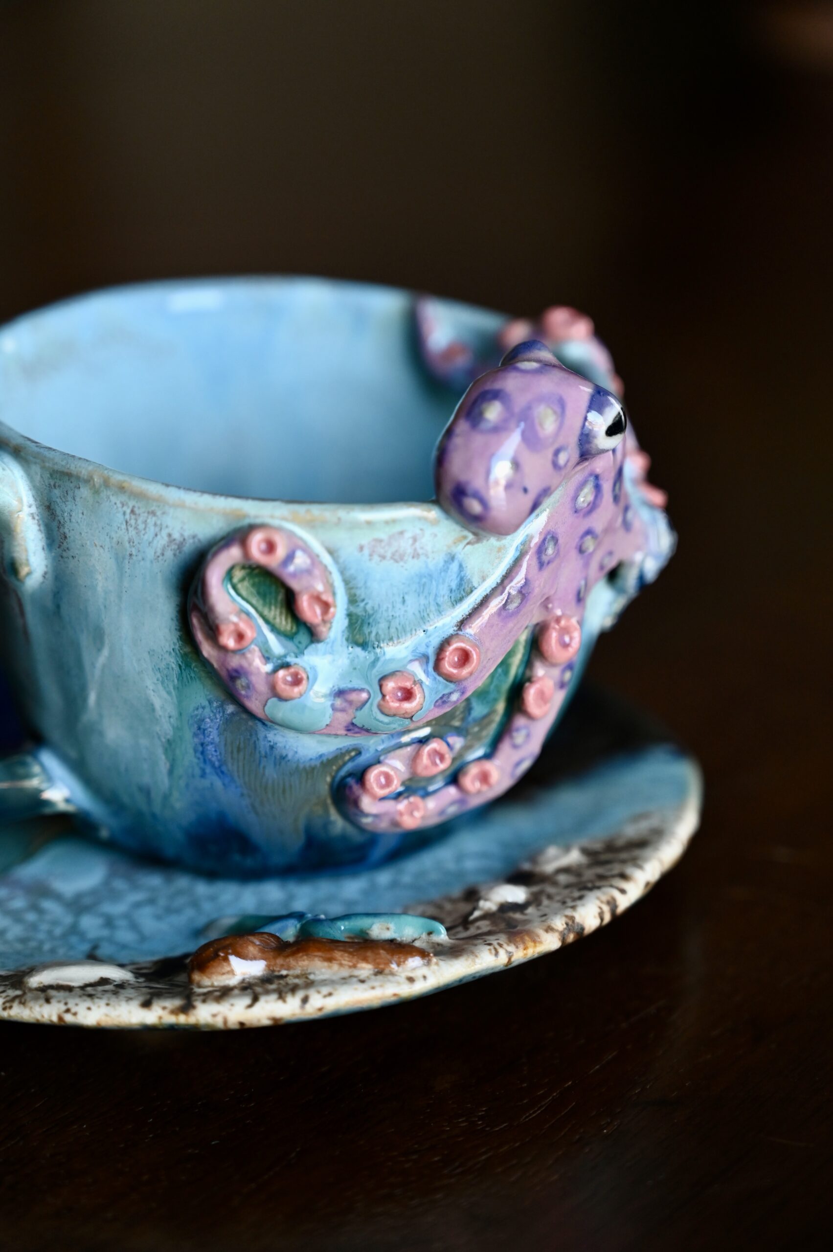 Ośmiornica oplata filiżankę, jakby chciała ją zatrzymać przy sobie.