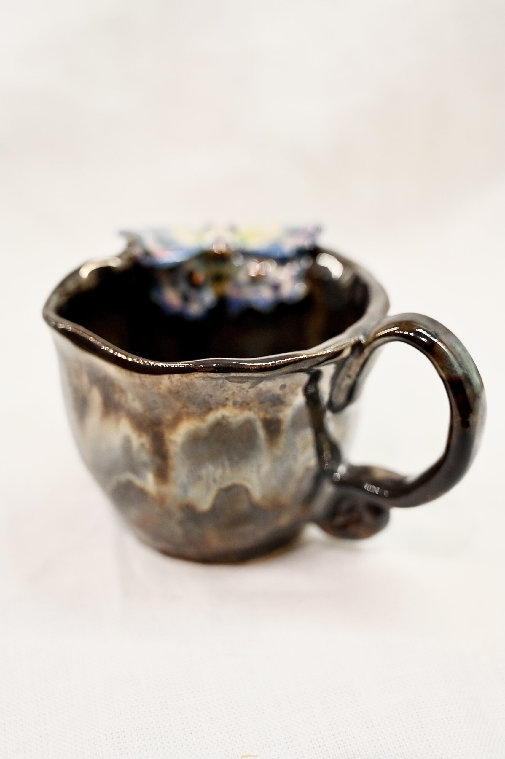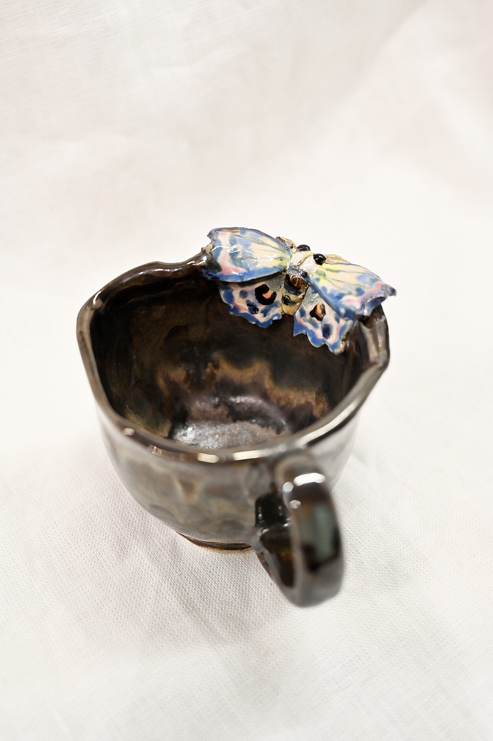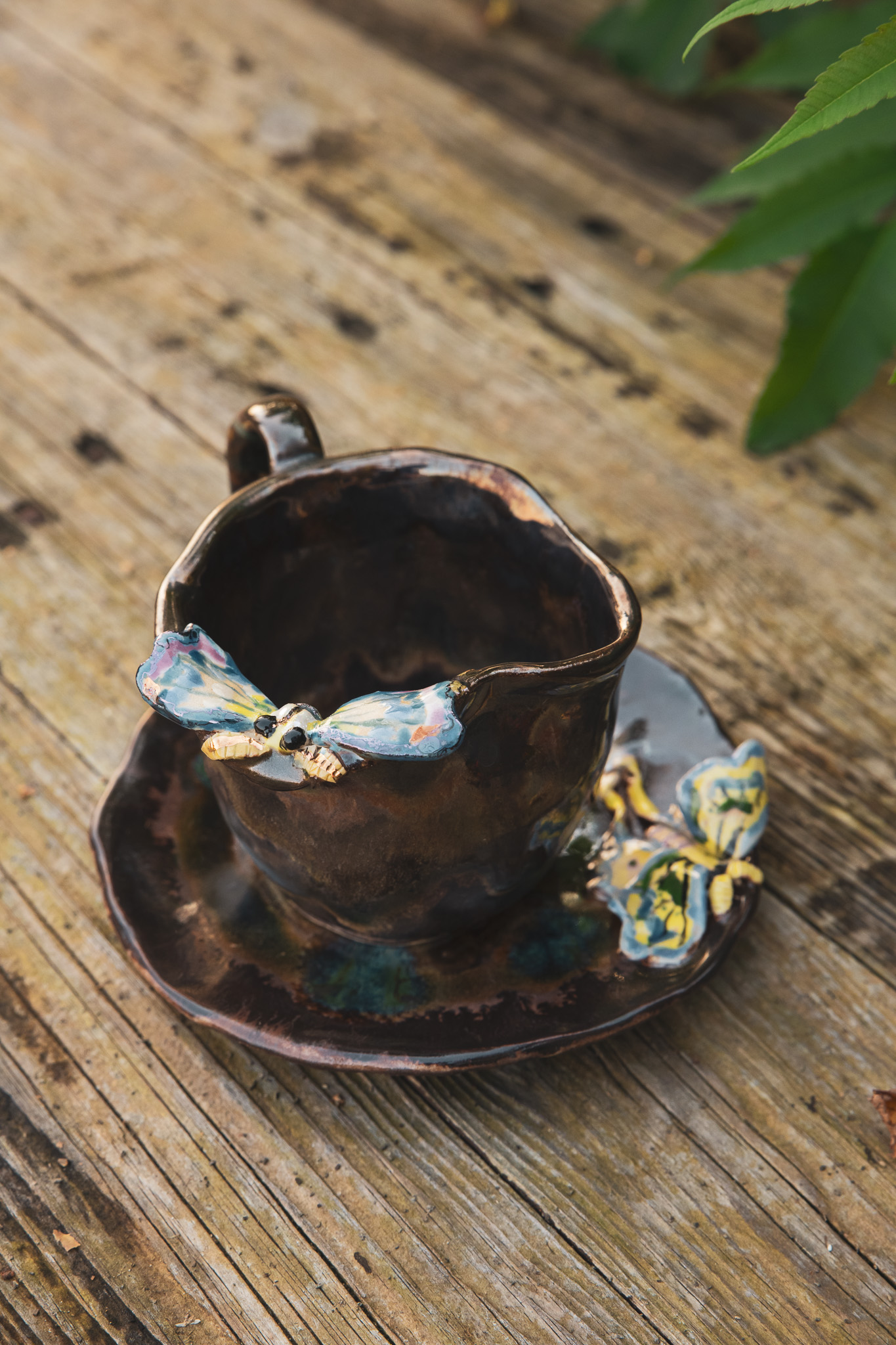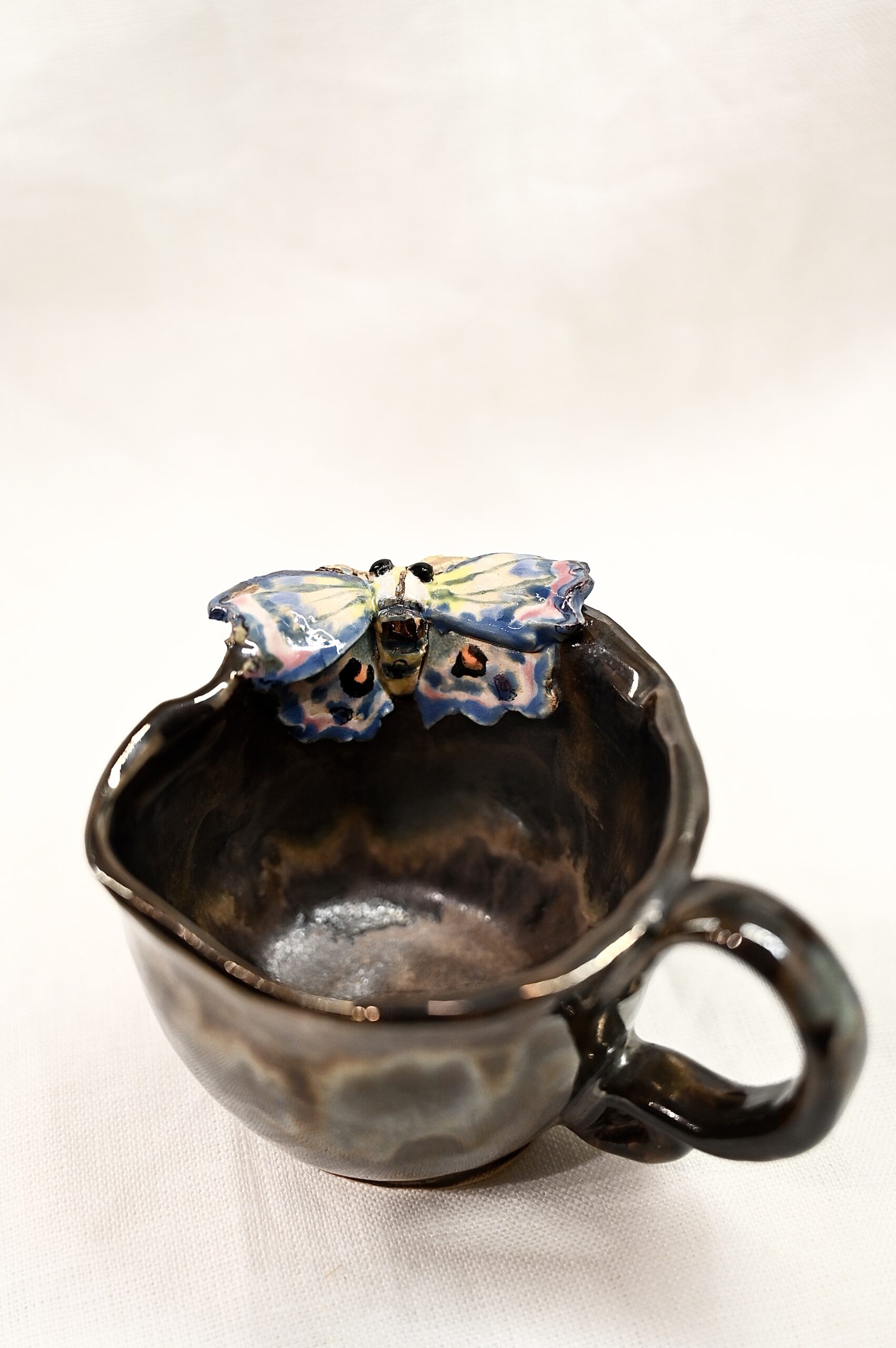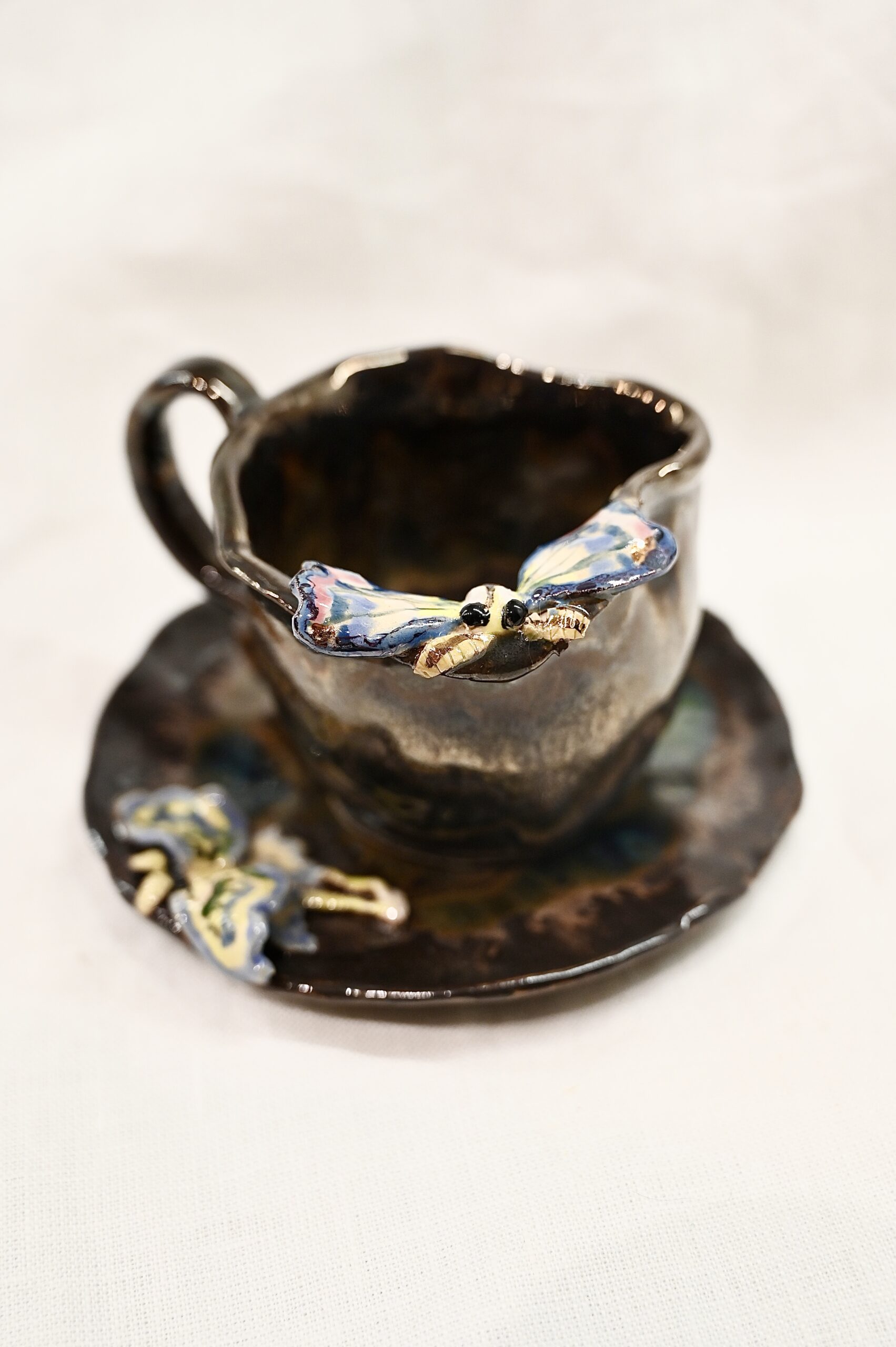Ta wyjątkowa filiżanka w głębokim brązie zdobiona jest ręcznie rzeźbioną ćmą, która subtelnie „wychodzi” na bok filiżanki, tworząc wrażenie delikatnego ruchu.