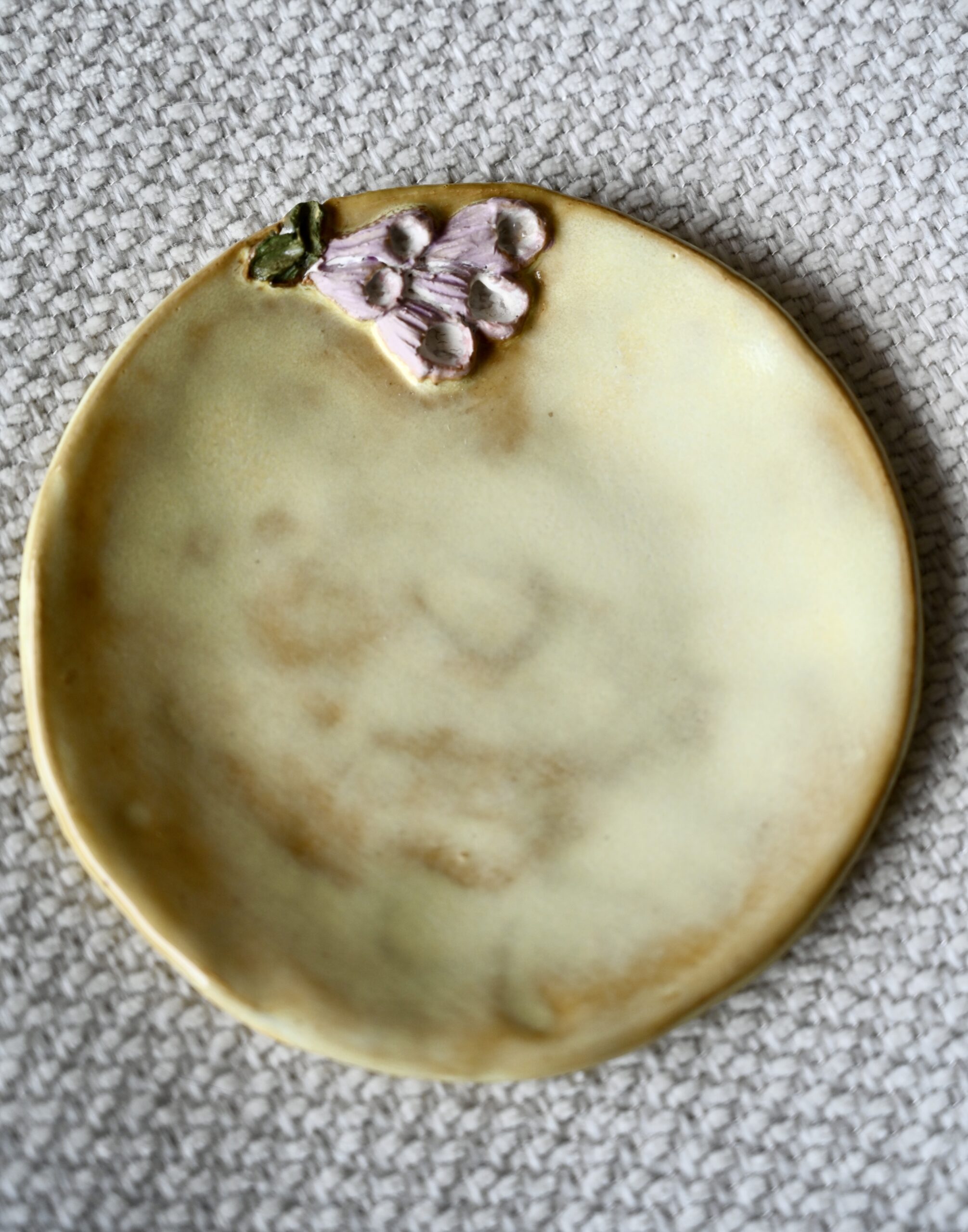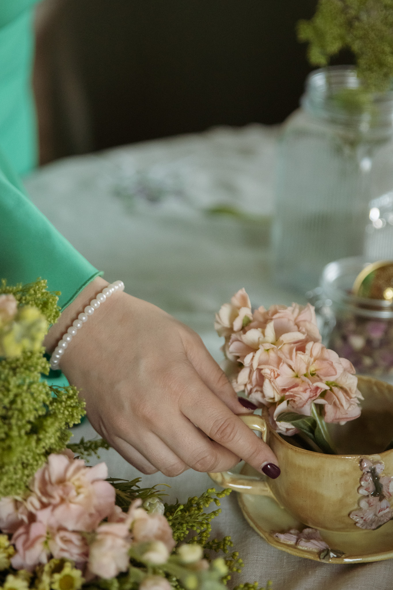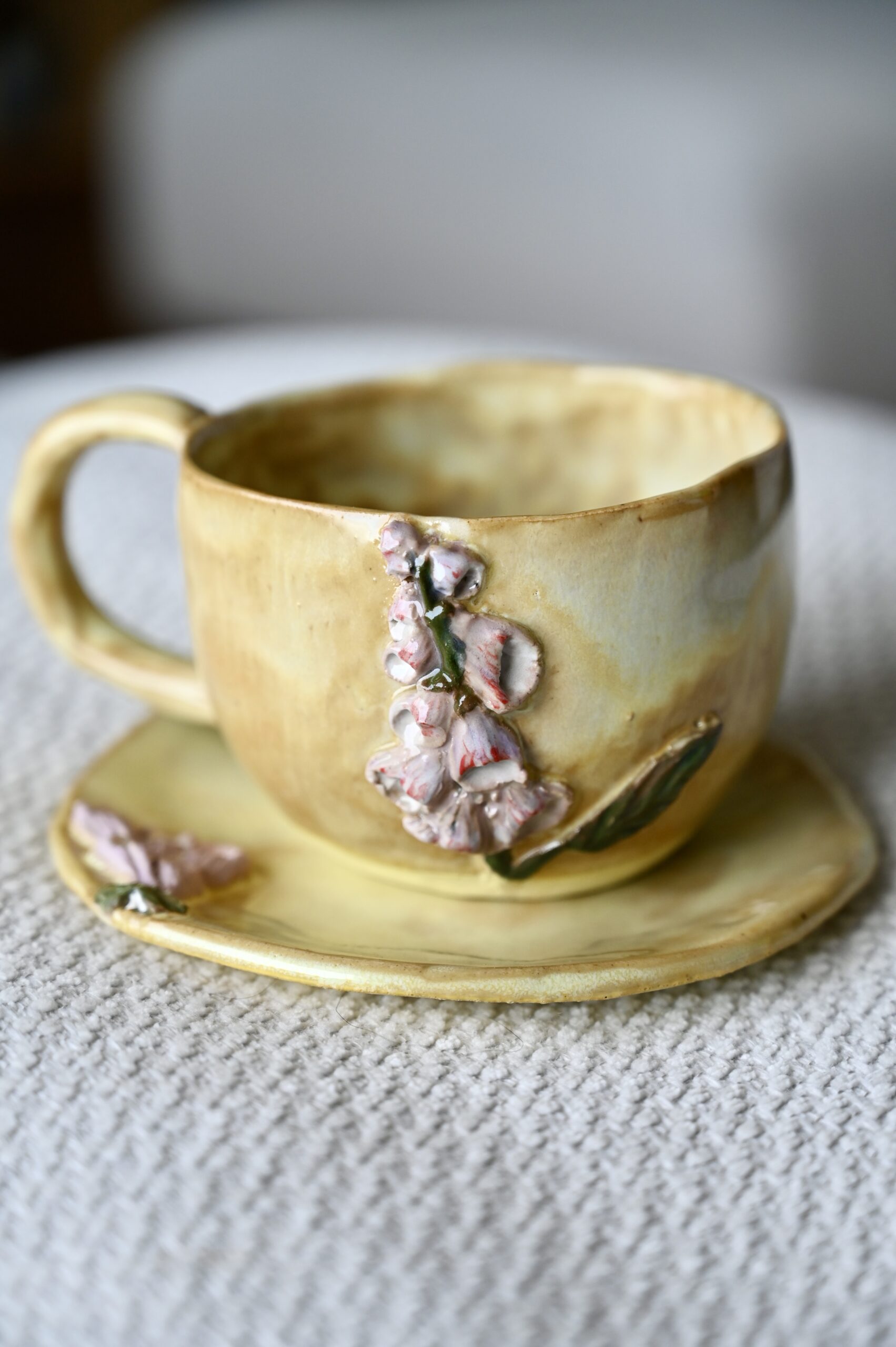 Filiżanka pełna światła, jak poranek skąpany w ciepłych promieniach słońca. Odcienie złocistej żółci otulają jej powierzchnię, tworząc przyjemną, promienną aurę. Na przodzie rozkwita rzeźbiona naparstnica – subtelna i wdzięczna, jej płatki w delikatnych odcieniach różu, zieleni i ciepłego złota zdają się kołysać na letnim wietrze.
