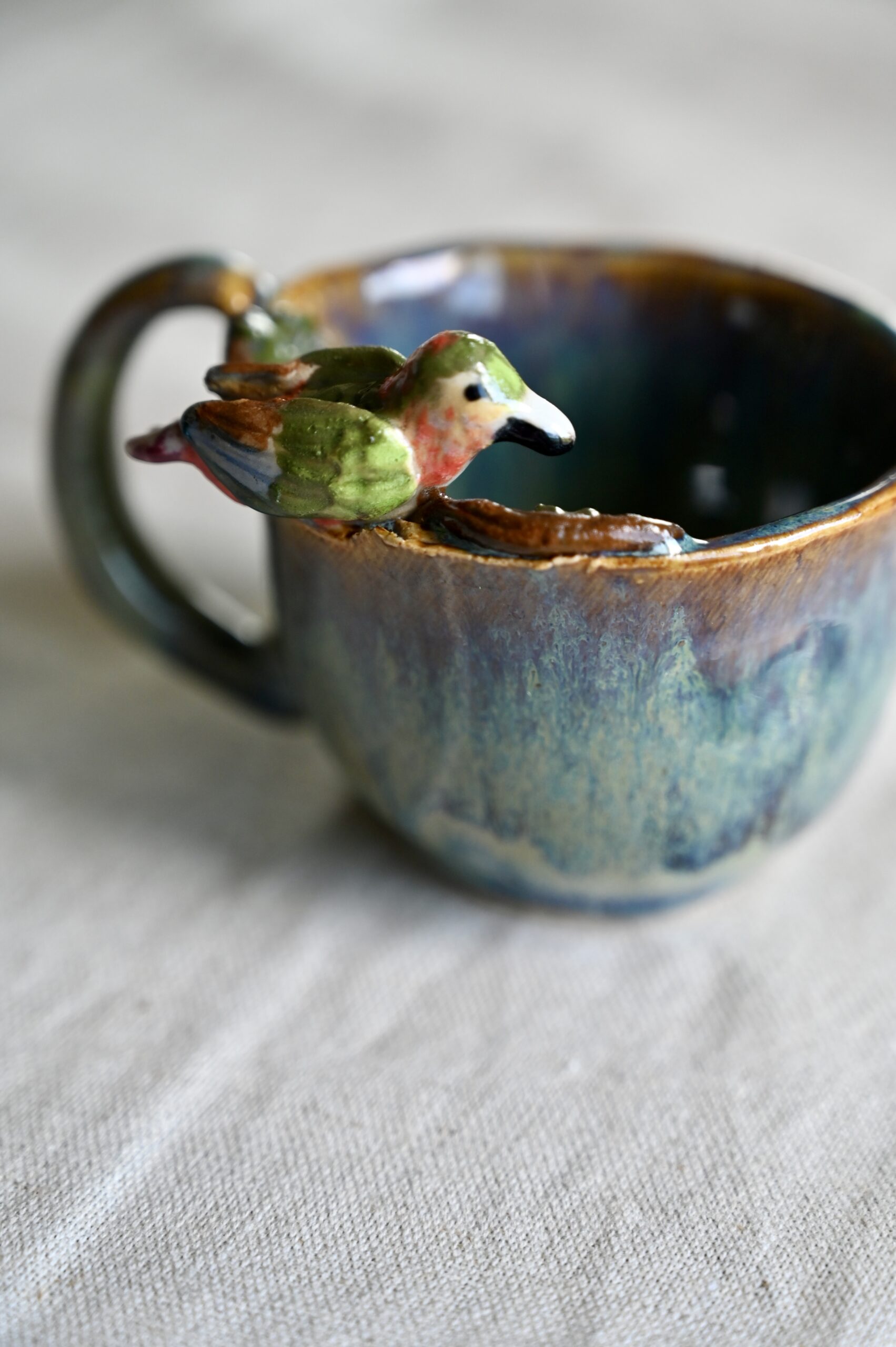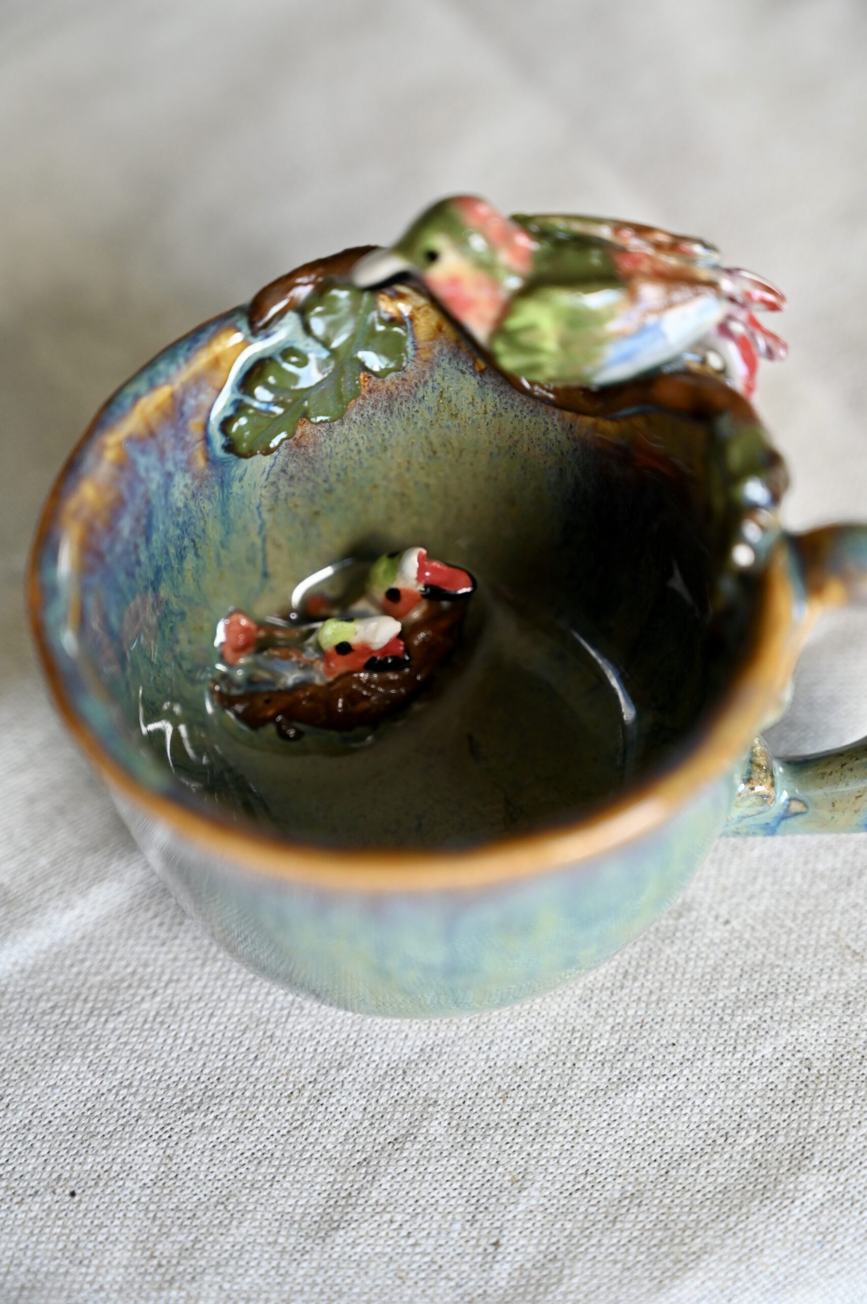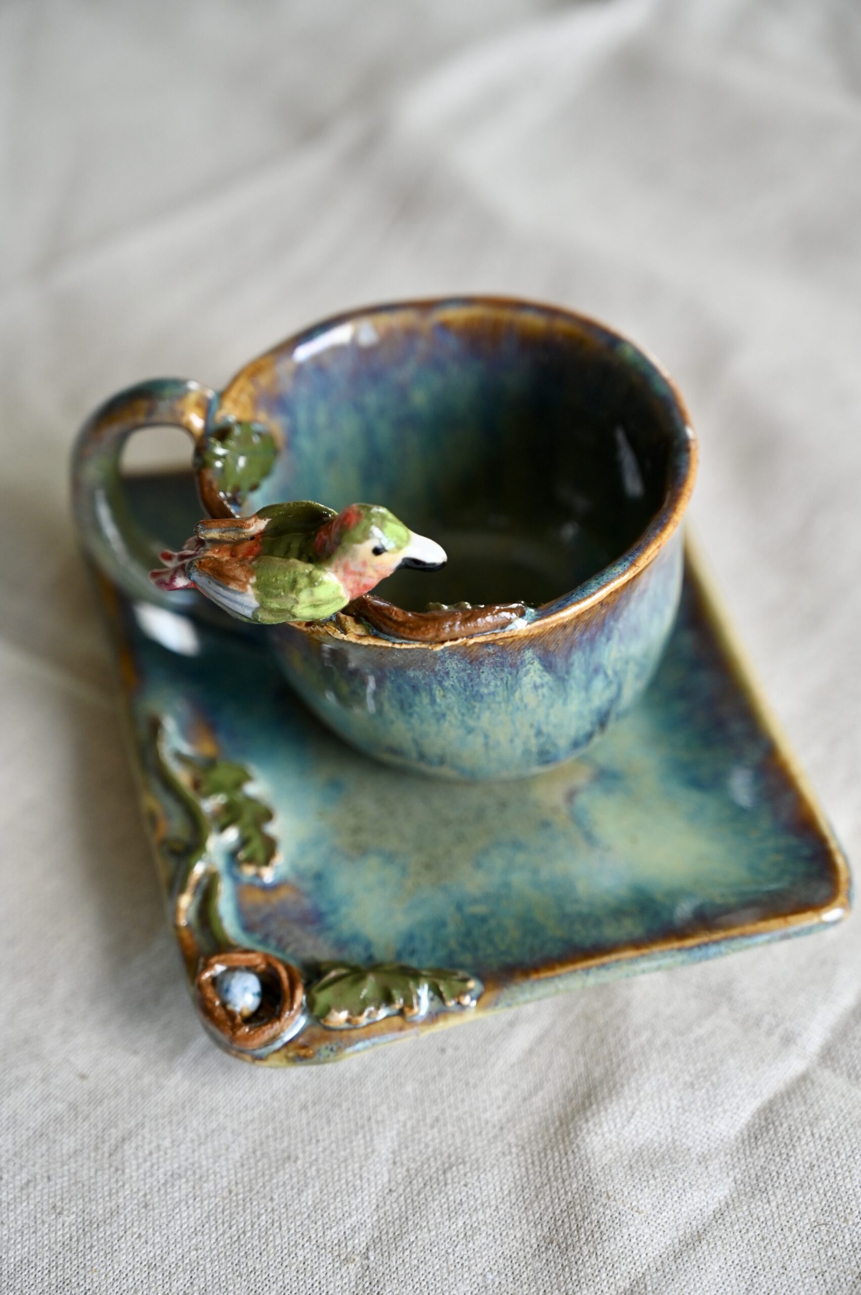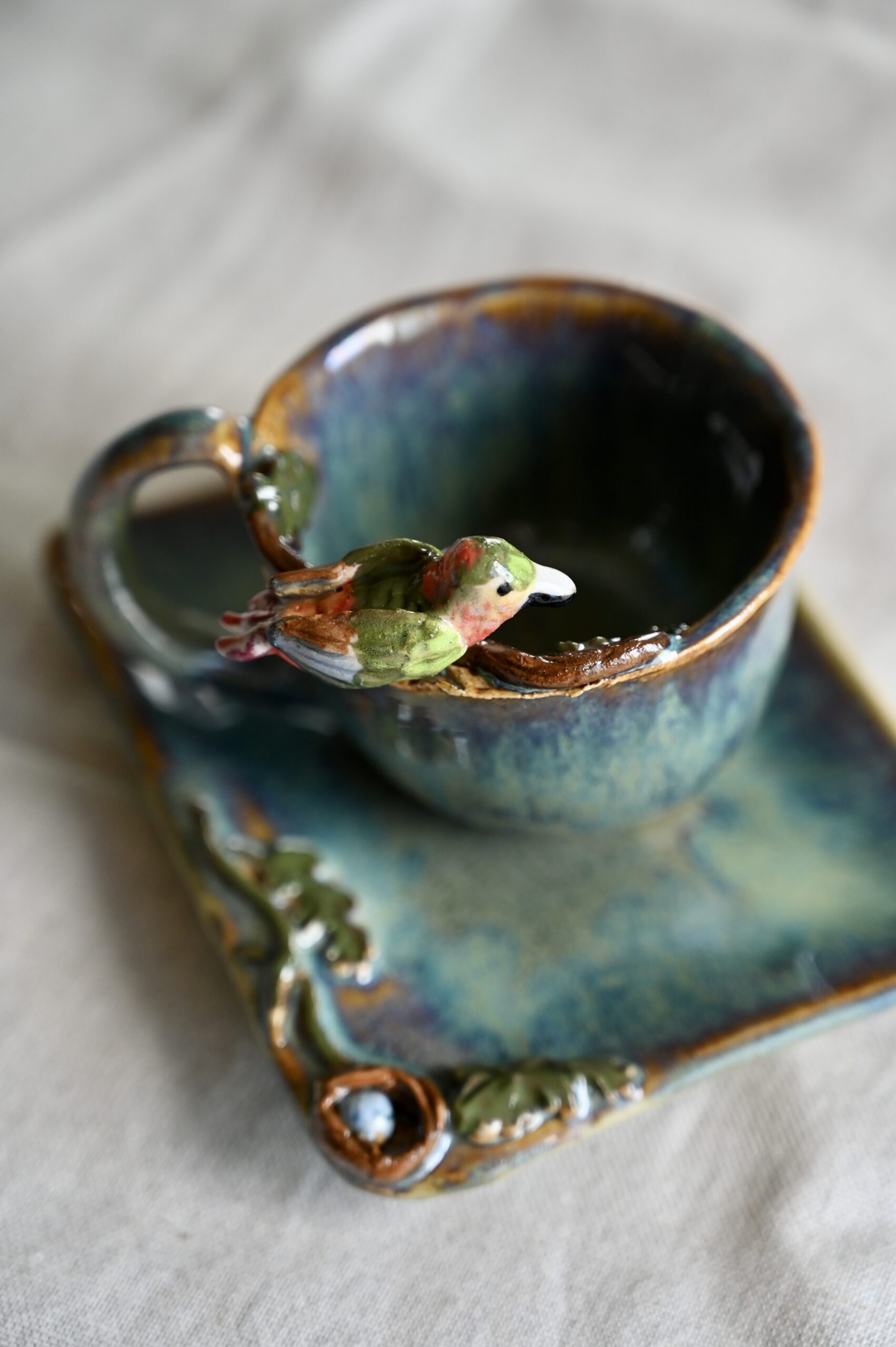 Mała filiżanka, która jest jak opowieść z ogrodu. Na jej krawędzi przysiadł ceramiczny ptaszek – czujny strażnik swojego gniazda. Na talerzyku, wśród wijących się pnączy, ukryło się maleńkie gniazdko z jajkiem. A w środku filiżanki – niespodzianka – dwa pisklęta z otwartymi dzióbkami czekają na swój pierwszy posiłek.