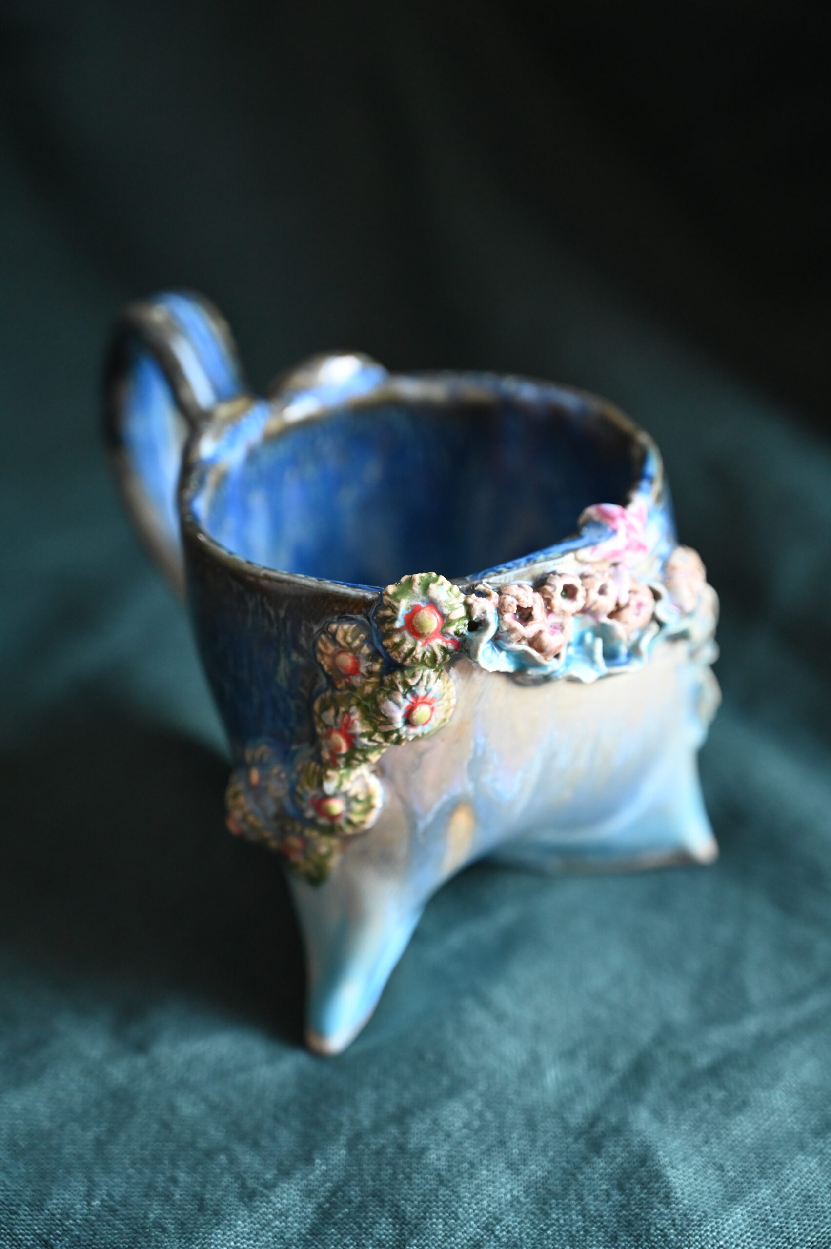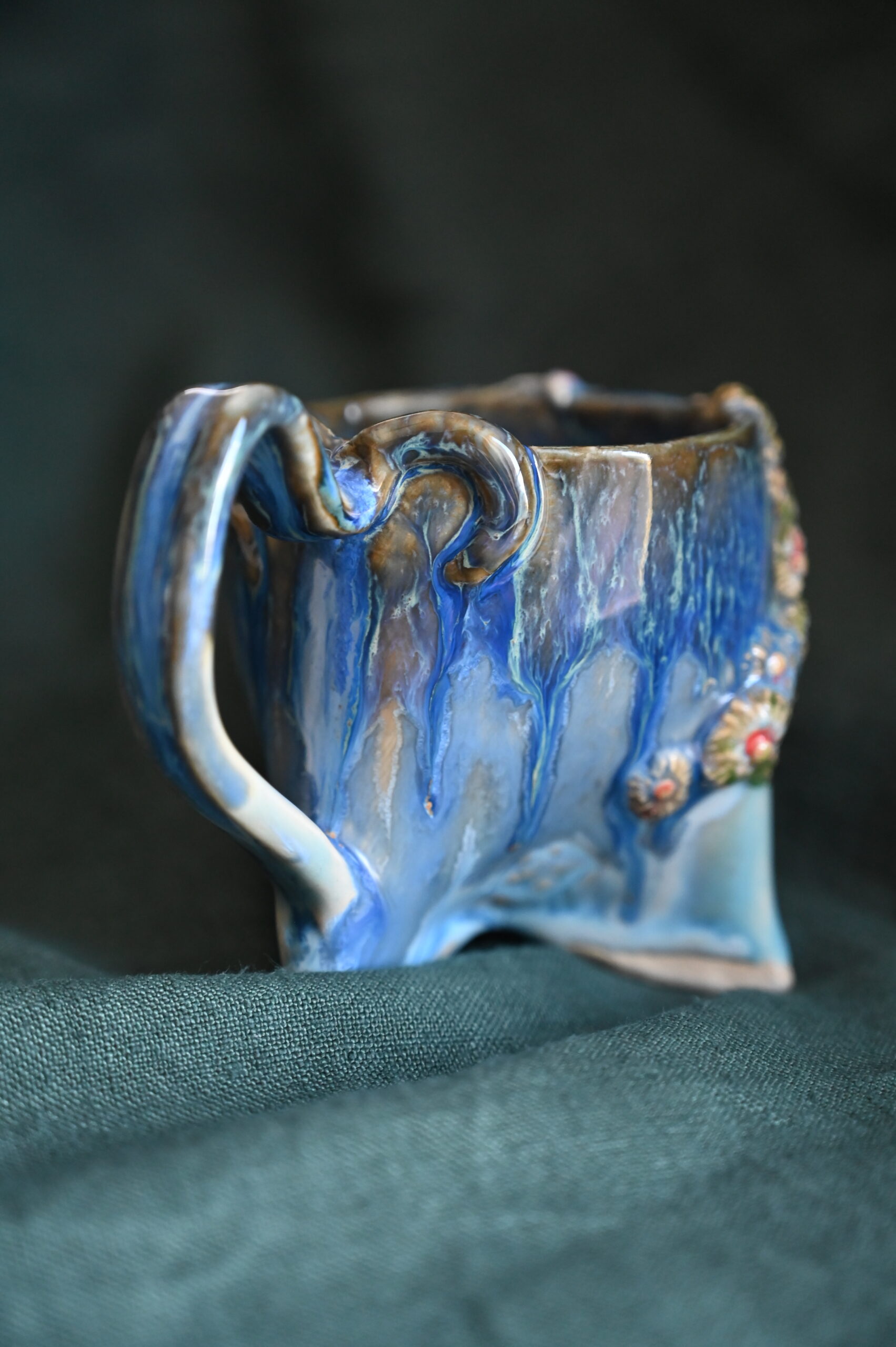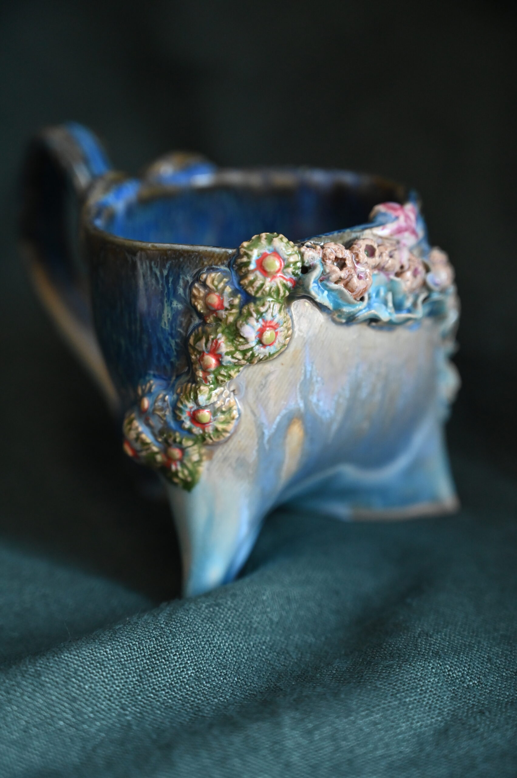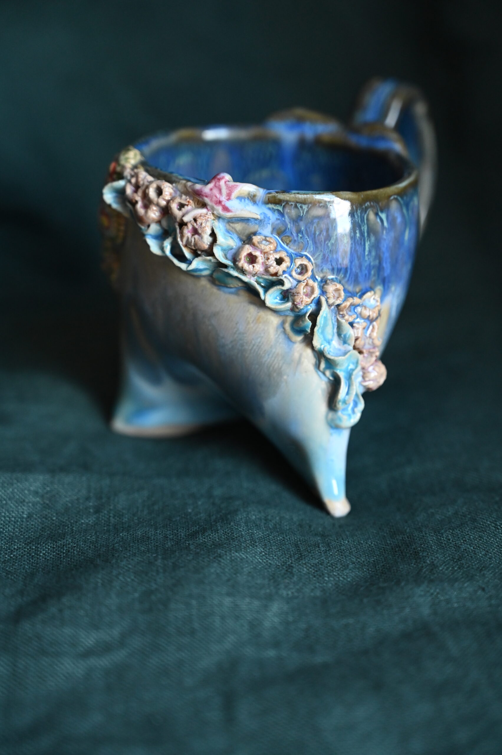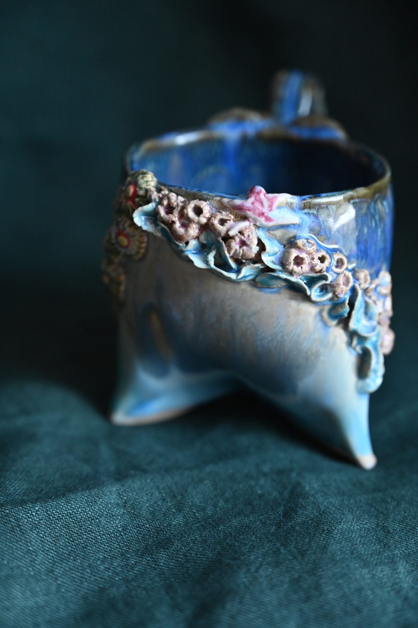 Kubeczek na trzech nóżkach – inny, figlarny, jak stwór z dna oceanu. Jego powierzchnię porasta ceramiczna rafa: korale, muszle, morskie kwiaty. A na dnie – rozgwiazda, cicha towarzyszka porannych naparów.