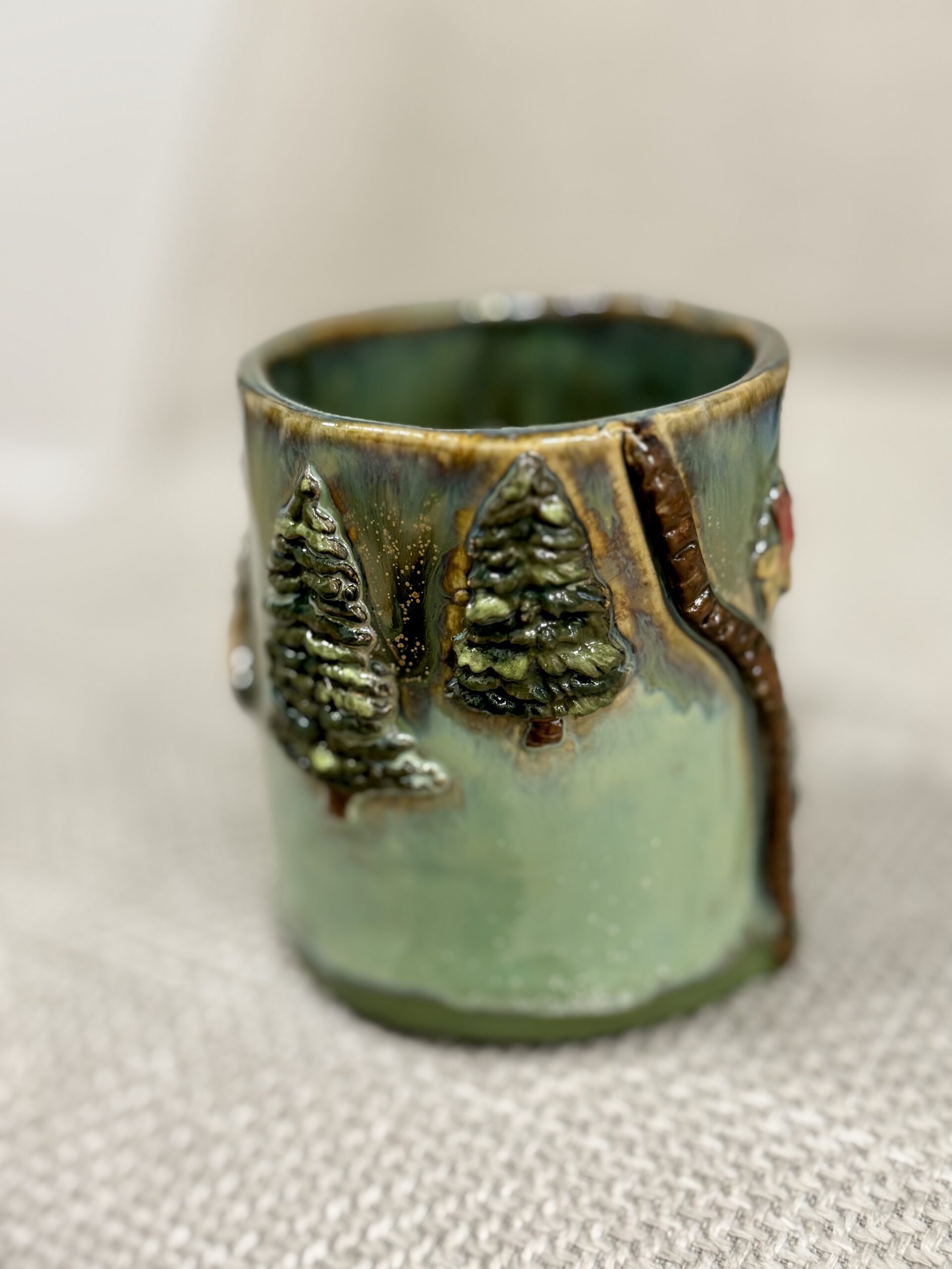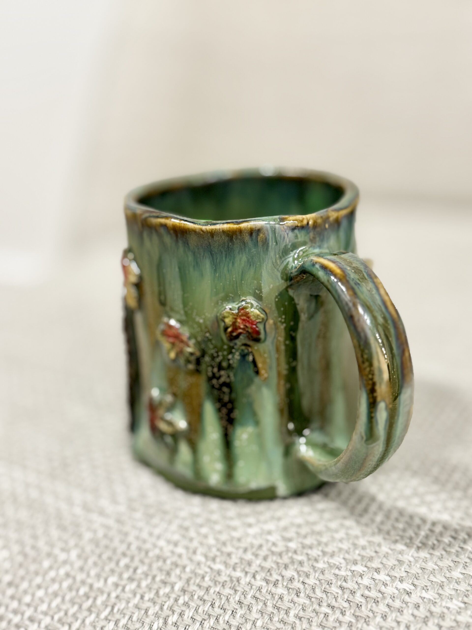 Ręcznie lepiony, rzeźbiony i szkliwiony.